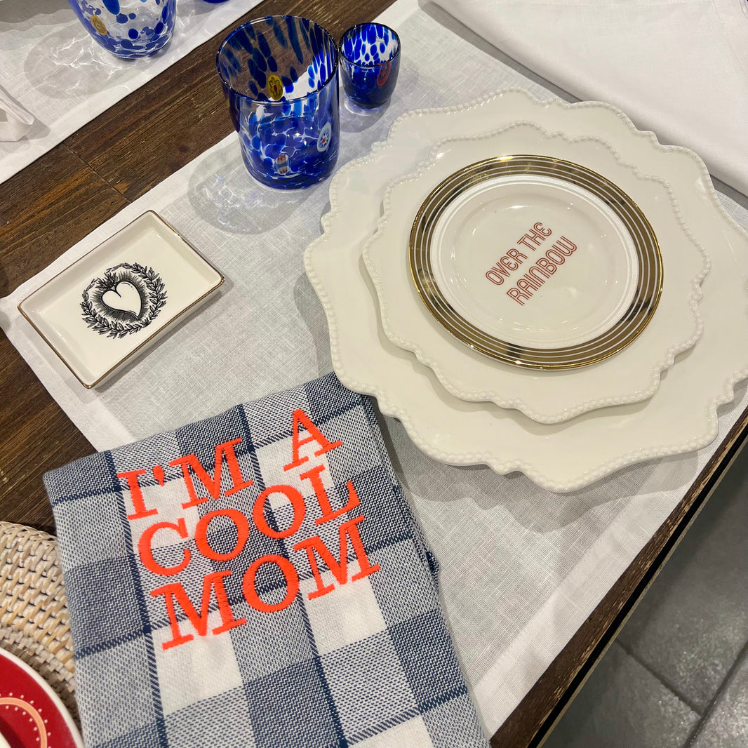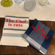 Torchon en 100% coton brodé The Chef is cute ou Kiss the Chef. Les carreaux peuvent varier.